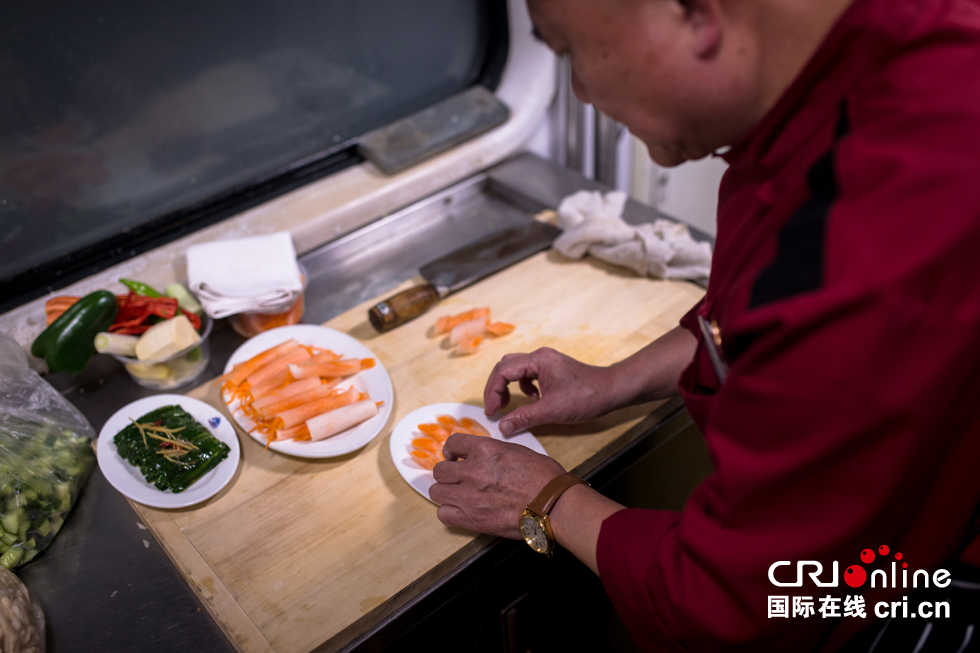 “有一名旅客,差不過每年春運都會坐這趟車從杭州出發(fā)前往海寧然后轉乘高鐵前往寧波,為的就是在我們車上吃一頓飯。”白師傅說。圖為白師傅制作菜品。