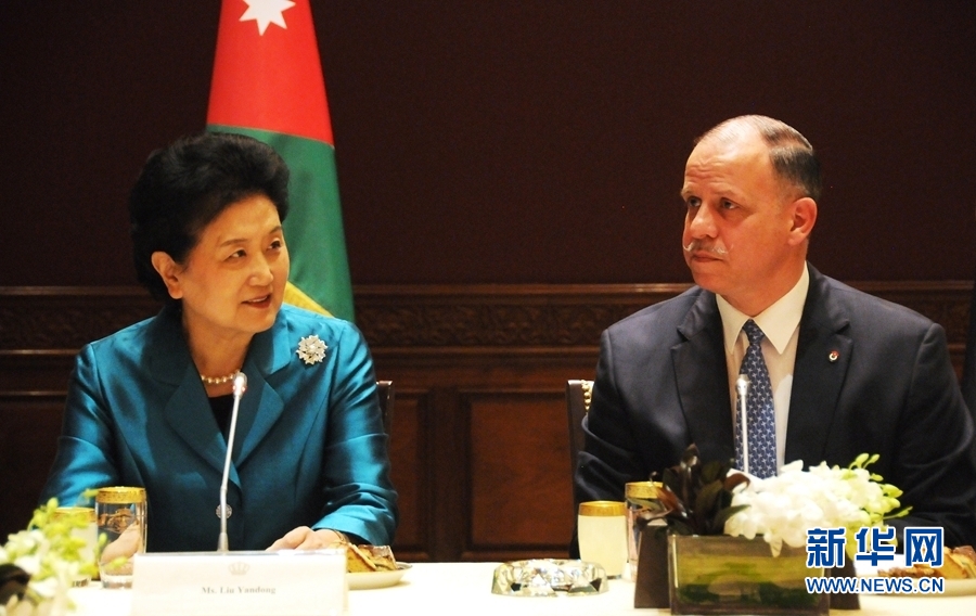 4月20日,在約旦首都安曼,約旦代國王費薩爾(右)會見中國國務(wù)院副總理劉延?xùn)|。新華社記者林曉蔚攝