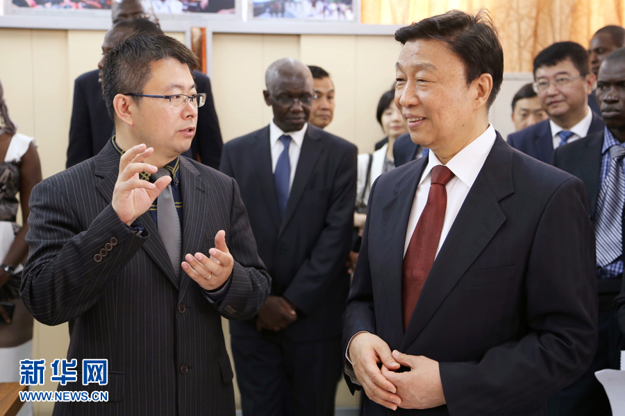 ??? 5月8日,在塞內(nèi)加爾達喀爾,正在塞內(nèi)加爾訪問的中國國家副主席李源潮(前右)參觀達喀爾大學(xué)孔子學(xué)院,并出席新教學(xué)樓揭牌儀式。新華社記者邢建橋攝
