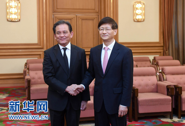 6月12日,中共中央政治局委員、中央政法委書記孟建柱在北京中南海會見泰國首席大法官、大理院院長維拉蓬·湯蘇萬。 新華社記者 張鐸 攝