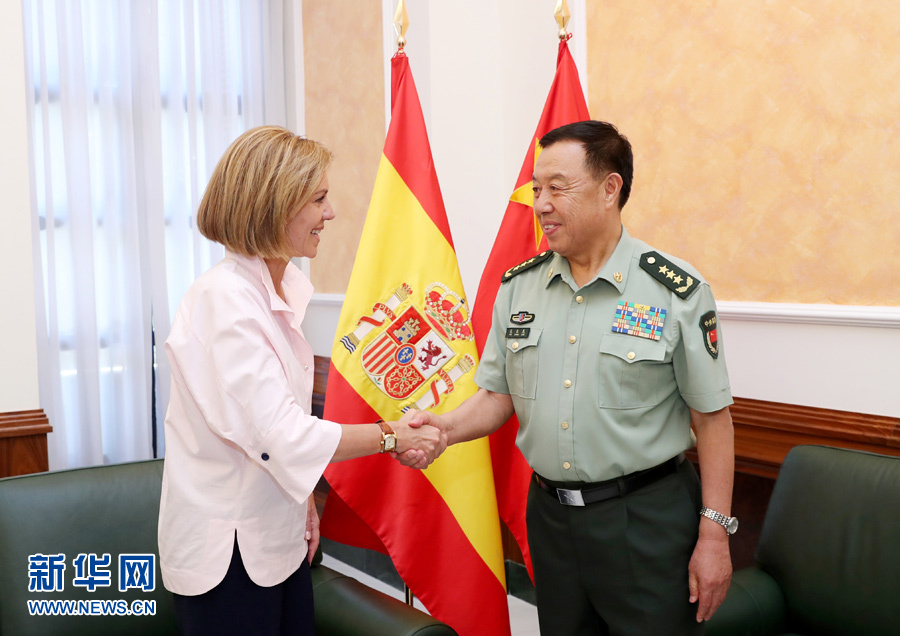6月13日,中央軍委副主席范長(zhǎng)龍(右)在馬德里會(huì)見(jiàn)西班牙國(guó)防大臣德科斯佩達(dá)爾。 新華社發(fā)(李曉偉攝)