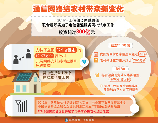 近年來,我國加大對中西部地區(qū)和農(nóng)村貧困地區(qū)移動互聯(lián)網(wǎng)基礎設施建設的投資力度,加快推進貧困地區(qū)網(wǎng)絡全覆蓋,著力降低貧困群眾享受信息生活門檻。截至2016年底,我國貧困村寬帶覆蓋率超過80%,農(nóng)村光纖寬帶用戶超過7400萬戶。今年將有望實現(xiàn)寬帶網(wǎng)絡再覆蓋8000個貧困村。同時,我國互聯(lián)網(wǎng)服務的質量和水平也在不斷提升。