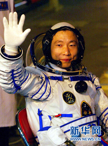 執(zhí)行中國(guó)首次載人航天飛行任務(wù)的航天員楊利偉出發(fā)登艙前揮手致意(資料照片)。新華社發(fā)