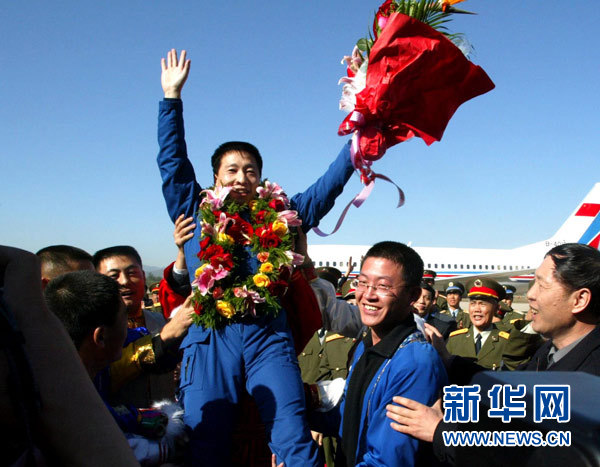 經(jīng)歷21小時(shí)23分鐘的飛行后,楊利偉從天上歸來(lái),中華民族千年飛天夢(mèng)圓。