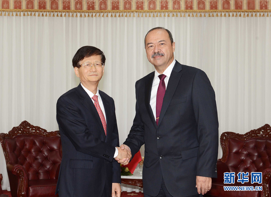 9月9日,中共中央政治局委員、中央政法委書(shū)記、中國(guó)和烏茲別克斯坦政府間合作委員會(huì)中方主席孟建柱(左)在塔什干會(huì)見(jiàn)烏總理、中烏政府間合作委員會(huì)烏方主席阿里波夫?! ⌒氯A社記者沙達(dá)提攝