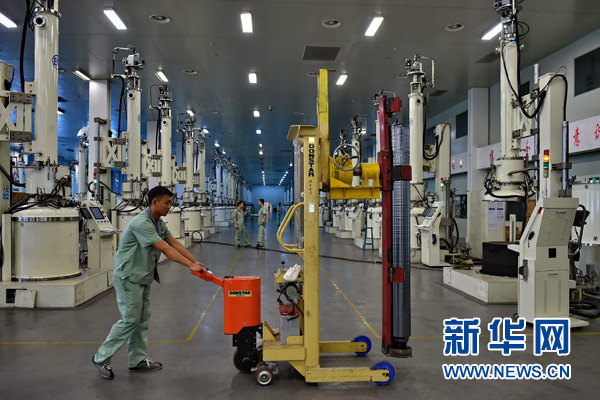 山西潞安集團(tuán)太陽(yáng)能科技有限責(zé)任公司的工人在搬運(yùn)剛剛生產(chǎn)出的單晶硅棒(7月20日攝)。新華社記者 曹陽(yáng) 攝