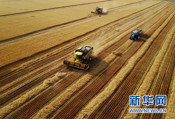在河南浚縣中鶴現(xiàn)代農(nóng)業(yè)示范園區(qū)的麥田里,收割機(jī)在收獲小麥(6月7日攝)。新華社記者 李安 攝