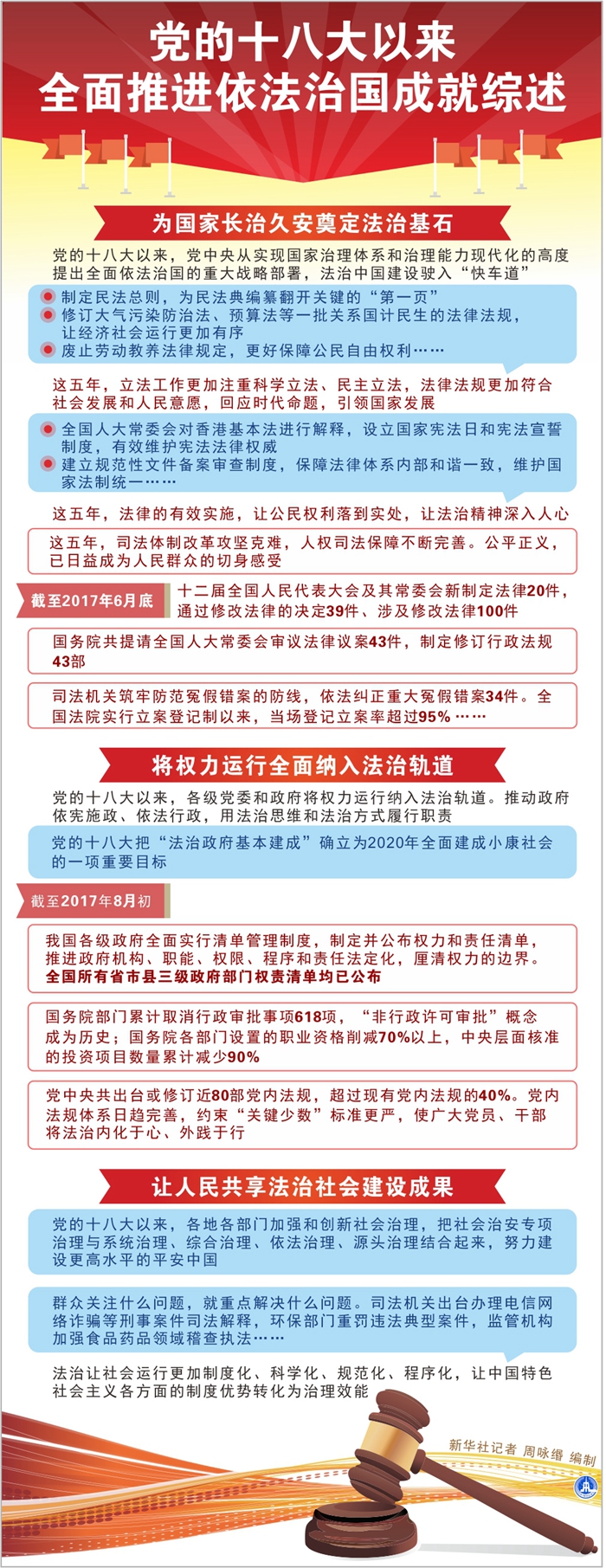從修改立法法賦予所有設(shè)區(qū)的市地方立法權(quán),到加強(qiáng)規(guī)范性文件違憲違法備案審查;從發(fā)布法治政府建設(shè)實(shí)施綱要,到司法體制改革“猛藥去疴”;從依法懲治腐敗推進(jìn)全面從嚴(yán)治黨,到依法治軍、從嚴(yán)治軍……五年來,改革發(fā)展穩(wěn)定、內(nèi)政外交國防、治黨治國治軍,由法治作保障、靠法治來推進(jìn)。
