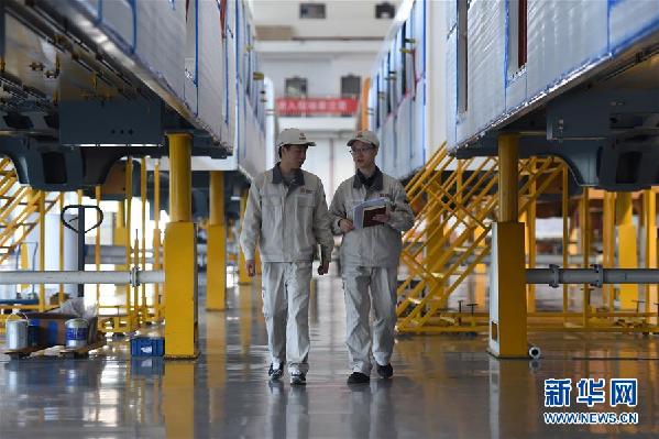 姚鴻洲(右)與同事在車間里從兩列正在實(shí)施組裝作業(yè)的車廂間走過(10月31日攝)。新華社記者 唐奕 攝