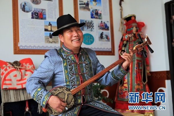 內蒙古鄂爾多斯市鄂托克前旗昂素鎮(zhèn)牧民、黨員中心戶孟克巴雅爾為游客彈唱蒙古族“祝酒歌”(11月6日攝)。新華社記者 王婧嬙 攝