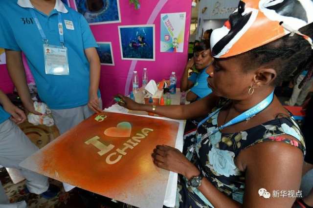 2014年8月23日,岡比亞奧委會(huì)官員在南京青奧村世界文化村制作體恤衫。新華社記者郭勇攝
