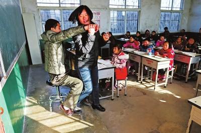 這節(jié)課,學生們聽得很認真。45分鐘的課程很快過去,下課后,妻子又把曹老師背了下來。“我們愛曹教師?!卑嗬镌S多小朋友告訴記者。