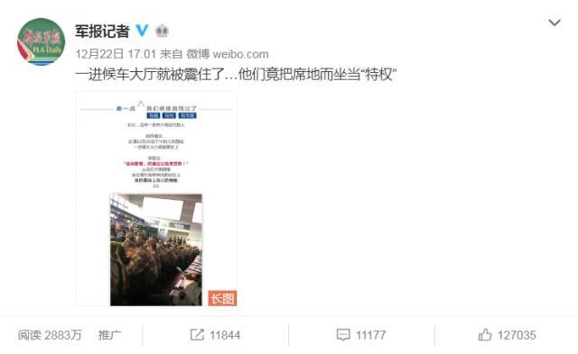 @宇:我去年夏天在蘭州站親眼看見一位被召回的軍官著急買票歸隊,被排隊的人罵沒素質(zhì),售票人員也不給優(yōu)先。最后我就讓他排我前面了。他們?yōu)閲胰嗣窀冻鎏?,愛護軍人,才是愛護自己。