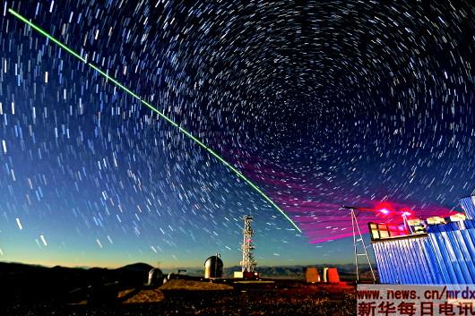 ▲“墨子號”量子科學實驗衛(wèi)星與阿里量子隱形傳態(tài)實驗平臺建立天地鏈路(合成照片,2016年12月9日攝)。新華社記者金立旺攝