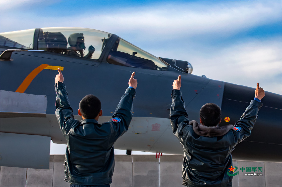 “金頭盔-2017”空軍對抗空戰(zhàn)競賽考核,戰(zhàn)機滑出,飛行員為戰(zhàn)友鼓勁加油。楊盼 攝影