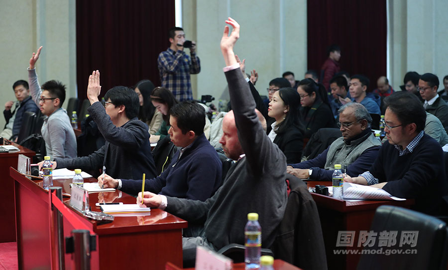12月28日下午,國(guó)防部舉行例行記者會(huì),國(guó)防部新聞局副局長(zhǎng)、國(guó)防部新聞發(fā)言人任國(guó)強(qiáng)大校回答記者提問(wèn),圖為例會(huì)現(xiàn)場(chǎng)。李曉偉 攝