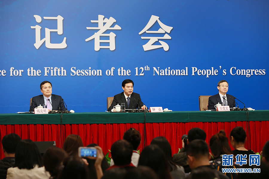 3月11日,十二屆全國(guó)人大五次會(huì)議新聞中心舉行記者會(huì),主題是“改革開(kāi)放調(diào)結(jié)構(gòu) 創(chuàng)新驅(qū)動(dòng)促發(fā)展”,商務(wù)部部長(zhǎng)鐘山、副部長(zhǎng)王受文、副部長(zhǎng)錢(qián)克明出席并回答中外記者的提問(wèn)。圖為記者會(huì)現(xiàn)場(chǎng)。 新華網(wǎng)/中國(guó)政府網(wǎng) 傅義洲 攝