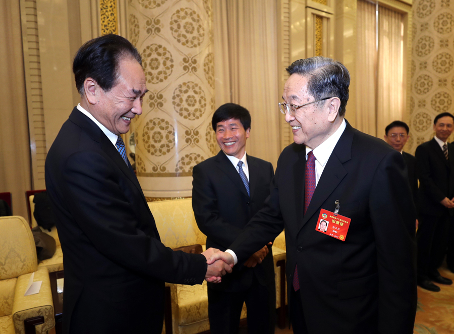 ??? 3月13日,中共中央政治局常委、全國政協(xié)主席俞正聲在北京人民大會堂看望參加全國政協(xié)十二屆五次會議新聞報道工作的中央主要新聞媒體負責(zé)同志和記者代表,向參加大會報道的新聞工作者表示誠摯慰問和衷心感謝。這是俞正聲與新華社社長蔡名照握手。新華社記者 鞠鵬 攝