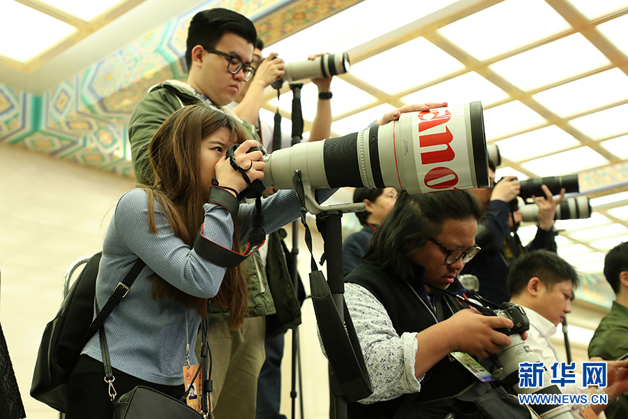 3月15日上午,國務(wù)院總理李克強在人民大會堂三樓金色大廳會見采訪十二屆全國人大五次會議的中外記者并回答記者提出的問題。圖為記者會現(xiàn)場的攝影記者。新華網(wǎng)/中國政府網(wǎng) 翟子赫 攝?