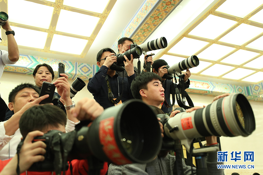 3月15日上午,國務(wù)院總理李克強(qiáng)在人民大會堂三樓金色大廳會見采訪十二屆全國人大五次會議的中外記者并回答記者提出的問題。圖為記者在現(xiàn)場拍攝。新華網(wǎng)/中國政府網(wǎng) 翟子赫 攝?