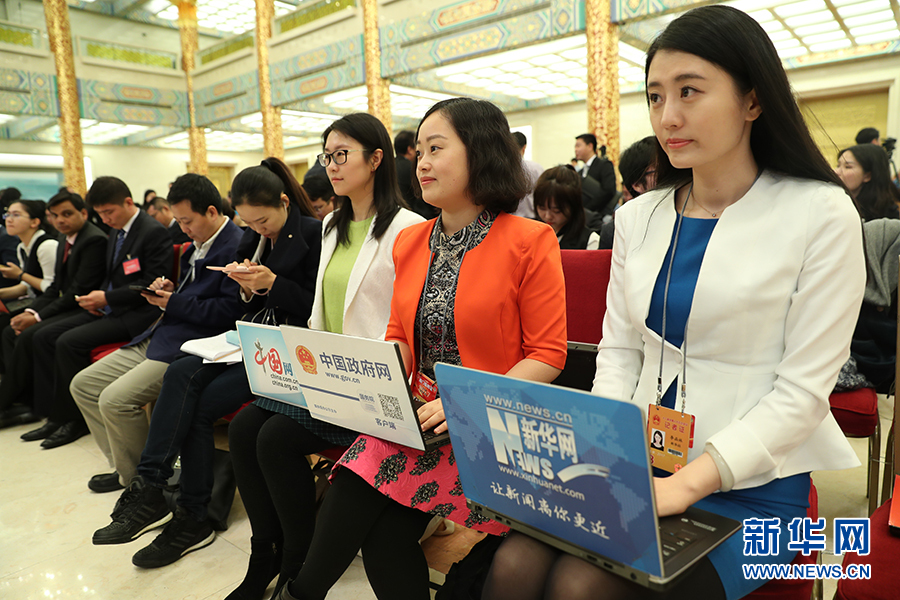 3月15日上午,國務(wù)院總理李克強(qiáng)在人民大會堂三樓金色大廳會見采訪十二屆全國人大五次會議的中外記者并回答記者提出的問題。圖為新華網(wǎng)記者在記者會現(xiàn)場。新華網(wǎng)/中國政府網(wǎng) 翟子赫 攝?