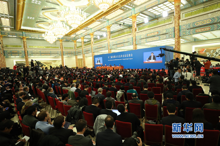 3月15日上午,國務(wù)院總理李克強在人民大會堂三樓金色大廳會見采訪十二屆全國人大五次會議的中外記者并回答記者提出的問題。圖為記者會現(xiàn)場。新華網(wǎng)/中國政府網(wǎng) 翟子赫 攝