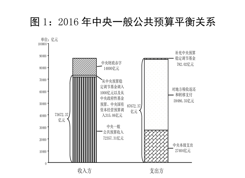 中央一般公共預(yù)算收入72357.31億元,為調(diào)整預(yù)算的100%,比2015年同口徑增長(zhǎng)1.2%。加上從中央預(yù)算穩(wěn)定調(diào)節(jié)基金調(diào)入1000億元,從中央政府性基金預(yù)算、中央國(guó)有資本經(jīng)營(yíng)預(yù)算調(diào)入315.06億元,收入總量為73672.37億元。中央一般公共預(yù)算支出86890.35億元(其中,中央本級(jí)支出27404億元,中央對(duì)地方稅收返還和轉(zhuǎn)移支付59486.35億元),完成調(diào)整預(yù)算的99.1%,增長(zhǎng)4.5%。加上補(bǔ)充中央預(yù)算穩(wěn)定調(diào)節(jié)基金782.02億元,支出總量為87672.37億元。收支總量相抵,中央財(cái)政赤字14000億元,與預(yù)算持平。2016年中央預(yù)備費(fèi)預(yù)算500億元,實(shí)際支出146.1億元,剩余353.9億元全部轉(zhuǎn)入中央預(yù)算穩(wěn)定調(diào)節(jié)基金。2016年末,中央財(cái)政國(guó)債余額120066.75億元,控制在年度預(yù)算限額125908.35億元以內(nèi);中央預(yù)算穩(wěn)定調(diào)節(jié)基金余額2678.06億元(含通過(guò)收回中央財(cái)政結(jié)轉(zhuǎn)資金補(bǔ)充1501.83億元)。