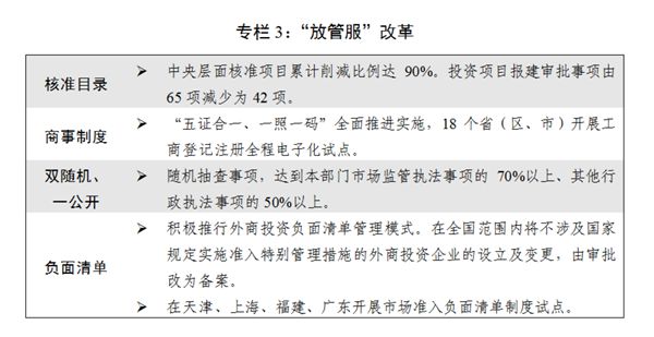 一是簡(jiǎn)政放權(quán)放管結(jié)合優(yōu)化服務(wù)改革向縱深推進(jìn)。在提前完成本屆政府減少行政審批事項(xiàng)三分之一目標(biāo)的基礎(chǔ)上,去年又取消165項(xiàng)國(guó)務(wù)院部門及其指定地方實(shí)施的審批事項(xiàng),清理規(guī)范192項(xiàng)審批中介服務(wù)事項(xiàng)、220項(xiàng)職業(yè)資格許可認(rèn)定事項(xiàng)。第三次修訂政府核準(zhǔn)的投資項(xiàng)目目錄。商事制度改革繼續(xù)深化。全面推行“雙隨機(jī)、一公開”,增強(qiáng)事中事后監(jiān)管的有效性,推進(jìn)“互聯(lián)網(wǎng)+政務(wù)服務(wù)”。市場(chǎng)準(zhǔn)入負(fù)面清單制度改革試點(diǎn)開局良好?!胺殴芊彼拇笃脚_(tái)建成運(yùn)行。