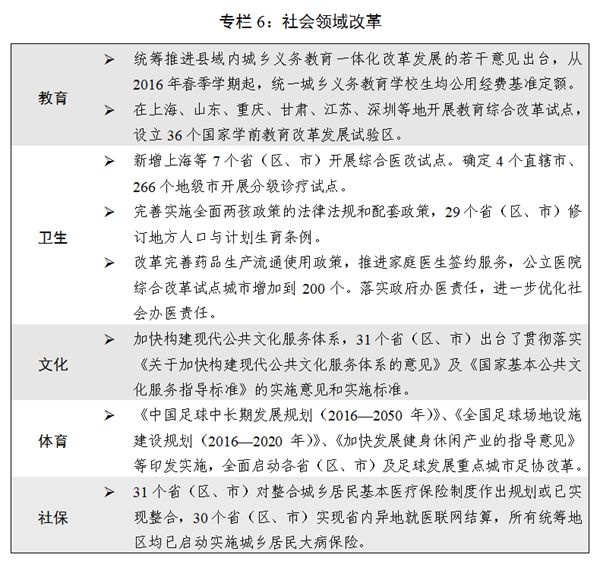 七是社會(huì)領(lǐng)域改革加快推進(jìn)。中央和國(guó)家機(jī)關(guān)公務(wù)用車制度改革全面完成,地方黨政機(jī)關(guān)公車改革深入推進(jìn)。行業(yè)協(xié)會(huì)商會(huì)與行政機(jī)關(guān)脫鉤改革第二批試點(diǎn)啟動(dòng)實(shí)施。加快不動(dòng)產(chǎn)統(tǒng)一登記制度落地,全國(guó)100%的地(市、州)、98%的縣(市、區(qū))實(shí)現(xiàn)“發(fā)新停舊”。國(guó)家科技計(jì)劃管理改革繼續(xù)深化,以增加知識(shí)價(jià)值為導(dǎo)向的分配政策出臺(tái),科技成果轉(zhuǎn)化力度加大。教育領(lǐng)域綜合改革向縱深推進(jìn)。分級(jí)診療制度建設(shè)持續(xù)推進(jìn),城鄉(xiāng)居民基本醫(yī)療保險(xiǎn)制度整合取得實(shí)質(zhì)性進(jìn)展,個(gè)人衛(wèi)生支出占衛(wèi)生總費(fèi)用的比重下降到28.9%?!秶?guó)務(wù)院辦公廳關(guān)于全面放開養(yǎng)老服務(wù)市場(chǎng)提升養(yǎng)老服務(wù)質(zhì)量的若干意見》(國(guó)辦發(fā)〔2016〕91號(hào))印發(fā)實(shí)施。穩(wěn)步推進(jìn)機(jī)關(guān)事業(yè)單位養(yǎng)老保險(xiǎn)制度改革。加快構(gòu)建中國(guó)特色哲學(xué)社會(huì)科學(xué),實(shí)施哲學(xué)社會(huì)科學(xué)創(chuàng)新工程。足球改革加快推進(jìn)。