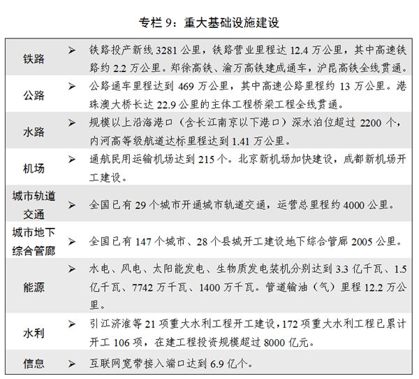 六是基礎(chǔ)設(shè)施網(wǎng)絡(luò)進(jìn)一步完善。加快推進(jìn)現(xiàn)代綜合交通運(yùn)輸體系建設(shè),交通基礎(chǔ)設(shè)施網(wǎng)絡(luò)總里程突破500萬公里。交通提質(zhì)增效、扶貧脫貧、重大基礎(chǔ)設(shè)施建設(shè)“一二三百”工程出臺(tái)實(shí)施,推進(jìn)多式聯(lián)運(yùn)發(fā)展,促進(jìn)通用航空業(yè)發(fā)展,推動(dòng)交通物流融合發(fā)展。能源生產(chǎn)和消費(fèi)革命戰(zhàn)略出臺(tái),能源供應(yīng)能力不斷增強(qiáng),非化石能源消費(fèi)比重預(yù)計(jì)上升到13.3%,煤炭消費(fèi)比重下降到62.0%。全國(guó)地級(jí)市基本建成光網(wǎng)城市,新一代信息基礎(chǔ)設(shè)施更加完善,建成全球最大的4G網(wǎng)絡(luò)。