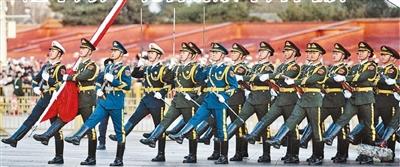 7時(shí)33分,編隊(duì)走出金水橋,齊步換正步行進(jìn)。3名分隊(duì)長拔刀出鞘,行舉刀禮。同一時(shí)間,90名隊(duì)員由肩槍換為端槍,威武前行。