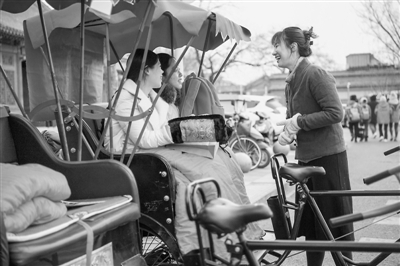在北京什剎海景區(qū)附近的胡同里,“后海八爺”車隊的新成員“海歸”女碩士王雪宜正蹬著人力三輪車為游客講解。