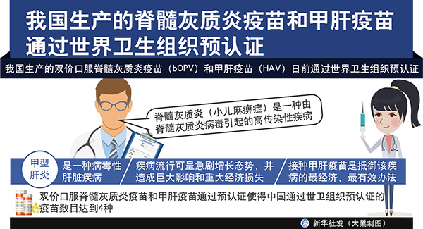 圖表:我國生產(chǎn)的脊髓灰質(zhì)炎疫苗和甲肝疫苗通過世界衛(wèi)生組織預認證 新華社發(fā) 大巢制圖