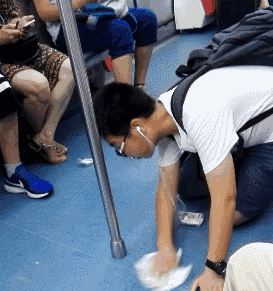 江蘇無(wú)錫地鐵1號(hào)線上,一個(gè)小男孩在用紙巾擦拭地面上的臟物,持續(xù)了十分鐘,直到擦干凈。?