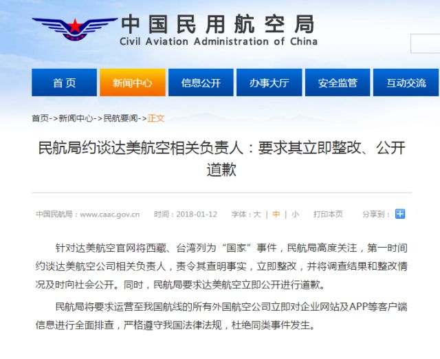 針對達美航空官網(wǎng)將西藏、臺灣列為“國家”事件,民航局高度關注,第一時間約談達美航空公司相關負責人,責令其查明事實,立即整改,并將調(diào)查結(jié)果和整改情況及時向社會公開。同時,民航局要求達美航空立即公開進行道歉。