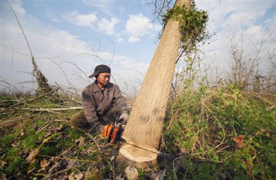 2017年11月27日,南洞庭湖自然保護(hù)區(qū)核心區(qū)內(nèi),一名工作人員在清理歐美黑楊?!⌒氯A社記者 李 尕?cái)z