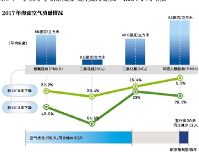 此外,2017年,海淀空氣質(zhì)量?jī)?yōu)良天數(shù)為226天,占比全年62.3%,較2016年增加30天;重污染天數(shù)為20天,較2016年減少13天。