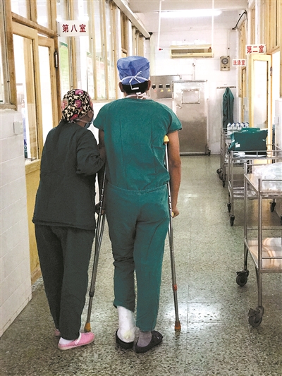 打著石膏拄著拐杖做手術(shù) 他說(shuō):“病人多醫(yī)生少,能做就做吧”