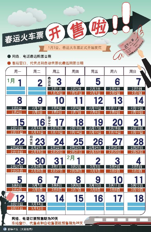 根據(jù)往年春運出行特點,初五至初八是返程高峰期。網(wǎng)絡(luò)、電話訂票預(yù)售期為30天,因此22日至25日將迎返程票搶票高峰。