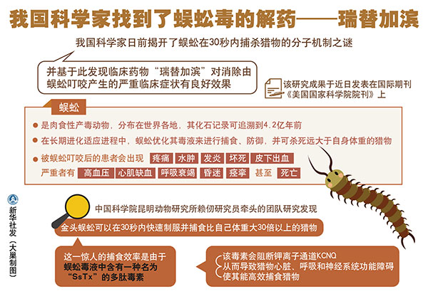 圖表:我國科學家找到了蜈蚣毒的解藥——瑞替加濱 新華社發(fā) 大巢制圖