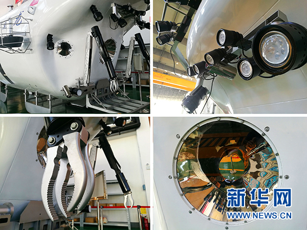 這是國家深?;貪撍髟囼?yàn)水池車間內(nèi)等比例“蛟龍”模型各部分細(xì)節(jié)(拼版照片,2017年12月19日攝)。新華社記者 李紫恒 攝