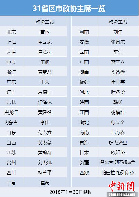 截至30日,在今年的省級(jí)地方兩會(huì)上,全國(guó)31省份已經(jīng)全部完成政協(xié)換屆,選舉出新一屆省級(jí)政協(xié)領(lǐng)導(dǎo)機(jī)構(gòu)。