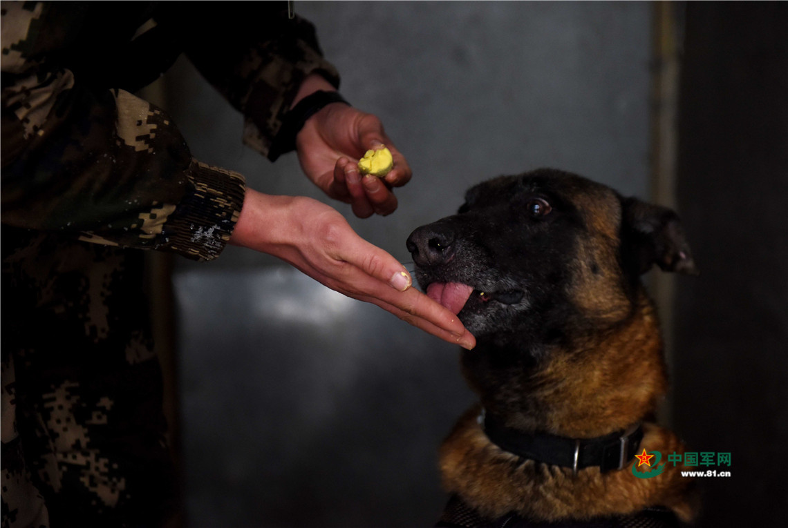1月27日,武警安徽總隊(duì)機(jī)動(dòng)支隊(duì)警犬班班長(zhǎng)王營(yíng)廣在給警犬“魯克”喂食煮雞蛋。