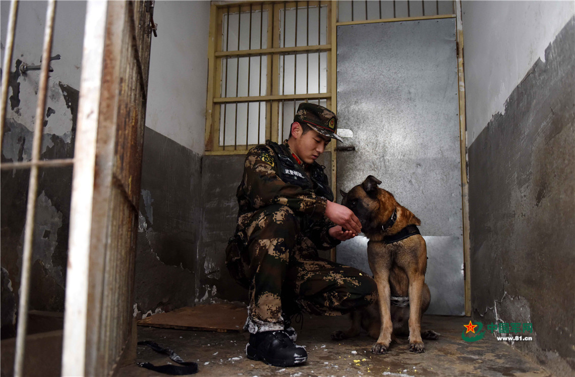 1月27日,武警安徽總隊(duì)機(jī)動支隊(duì)警犬班班長王營廣在給警犬“魯克”喂食煮雞蛋。