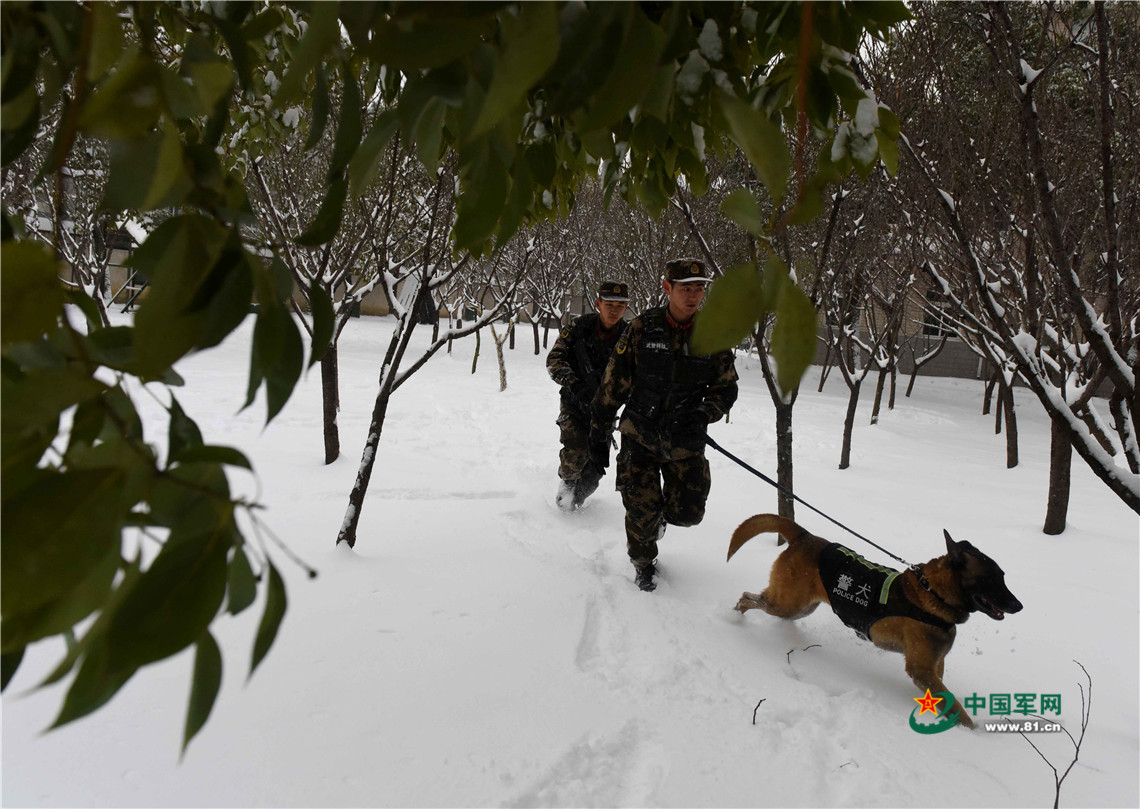 1月27日,武警安徽總隊(duì)機(jī)動(dòng)支隊(duì)警犬班班長(zhǎng)王營(yíng)廣(前)帶領(lǐng)警犬“魯克”進(jìn)行武裝追捕訓(xùn)練。