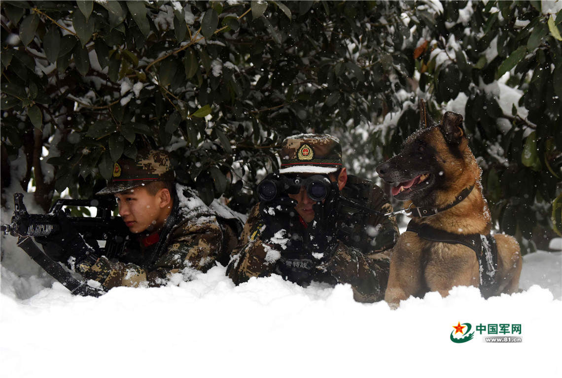 1月27日,武警安徽總隊(duì)機(jī)動(dòng)支隊(duì)警犬班班長(zhǎng)王營(yíng)廣帶領(lǐng)警犬“魯克”進(jìn)行隱蔽偵察訓(xùn)練。