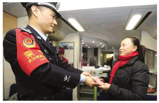 圖為武漢鐵路公安局武漢公安處乘務(wù)二大隊(duì)乘警魏國(guó)強(qiáng)(左)將找到的遺失錢(qián)財(cái)交給失主。趙軍 攝
