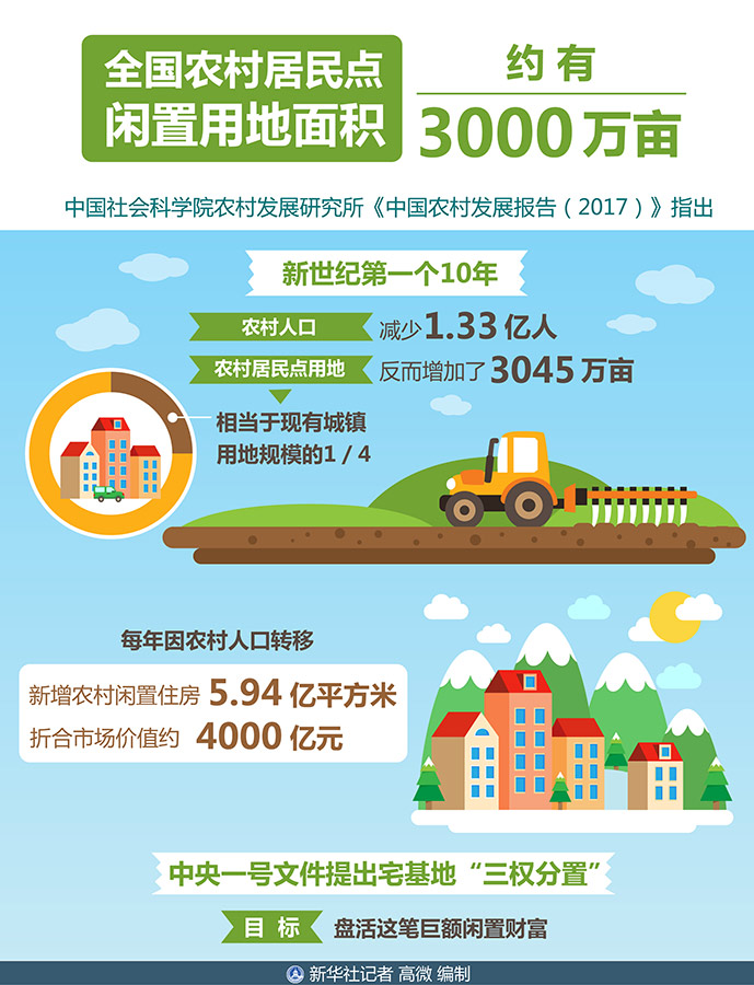 這是全國(guó)農(nóng)村居民點(diǎn)閑置用地大致面積。中國(guó)社會(huì)科學(xué)院農(nóng)村發(fā)展研究所《中國(guó)農(nóng)村發(fā)展報(bào)告(2017)》指出,新世紀(jì)第一個(gè)10年,農(nóng)村人口減少1.33億人,農(nóng)村居民點(diǎn)用地反而增加了3045萬畝,相當(dāng)于現(xiàn)有城鎮(zhèn)用地規(guī)模的1/4。每年因農(nóng)村人口轉(zhuǎn)移,新增農(nóng)村閑置住房5.94億平方米,折合市場(chǎng)價(jià)值約4000億元。