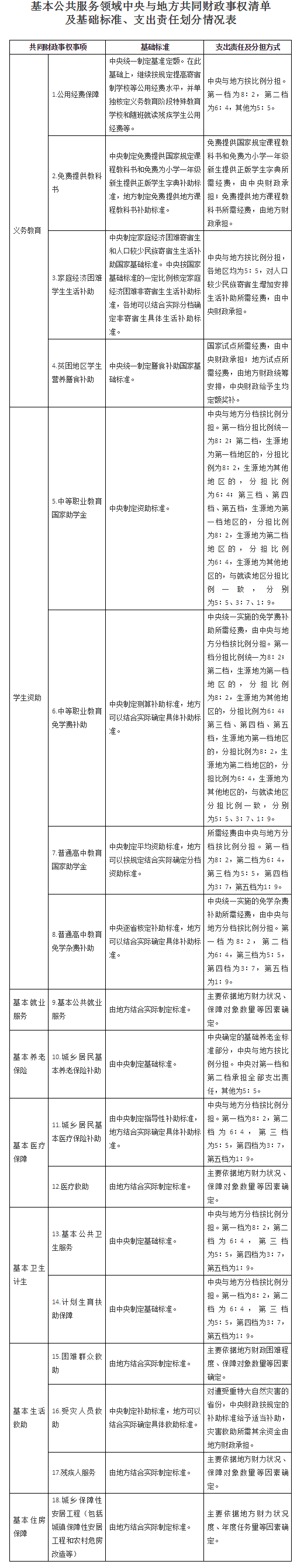 附:基本公共服務(wù)領(lǐng)域中央與地方共同財政事權(quán)清單及基礎(chǔ)標(biāo)準(zhǔn)、支出責(zé)任劃分情況表。來自中國政府網(wǎng)