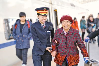 沈陽(yáng)鐵路部門采取多項(xiàng)新舉措,溫暖旅客回家路。圖為日前吉林至北京D74次列車長(zhǎng)劉露攙扶行動(dòng)不便的老年旅客乘車。